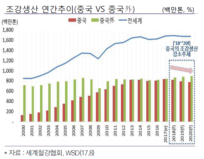 2018년에는 중국 조강생산량이 감소세로 전환될 것으로 보인다. 세계철강협회 전망에 따르면 중국은 2017년보다 1.8% 감소한 8.2억톤을 생산하면서 올해 세계 조강생산량은 전년비 0.5%가량 증가한 16억9,000톤으로 내다봤다.