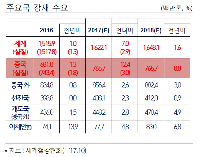 2017년 중국 수요는 증가세를 보였다. 세계철강협회 자료에 따르면 유도로 등 공식통꼐에 포함되지 않은 설비 폐쇄로 인해 표면적 수요 증가는 12.4%, 실질 증가는 3%를 기록할 것으로 전망된다.
