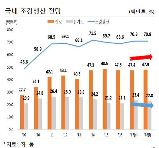 올해 역시 전기로강 감소를 전로강이 상쇄하며 전체 조강생산량은 2017년과 비슷한 수준을 유지할 것으로 홍 실장은 내다봤다.