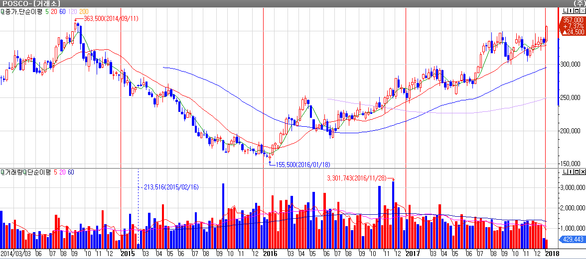 포스코(회장 권오준) 주가가 지난 2014년 9월 이후 3년 4개월 여만에 최고 가격을 기록하고 있다.