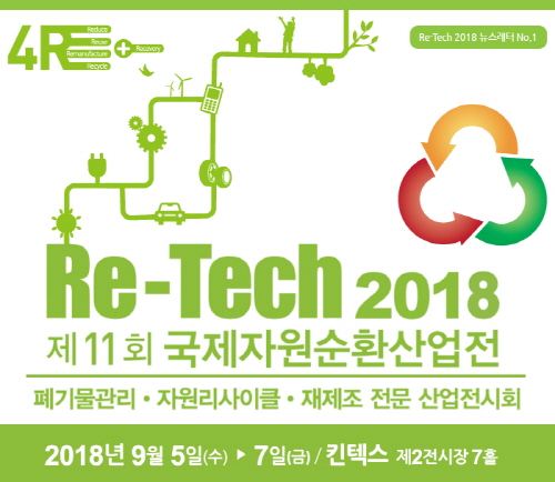 제11회 국제자원순환산업전(Re-Tech 2018)이 오는 9월 5일부터 7일까지 사흘간 일산 킨텍스 제2전시장 7홀에서 개최된다.