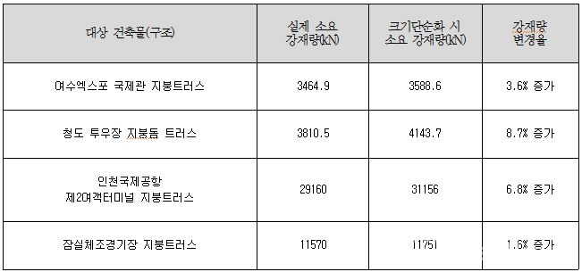 그 결과 건축 구조용 원형강관 사이즈의 단순화 및 표준화가 이뤄질 경우 소요되는 총 강재 물량이 약 5.2% 증가하는 것으로 나타났다. 하지만 자재 수급 및 제품 제작, 시공이 효율적으로 이뤄져 공기 단축에 유리한 강점으로 작용한다. 이로 인해 제품 경쟁력 강화 및 수요 확대에는 긍정적인 영향을 끼칠 것으로 예상된다.