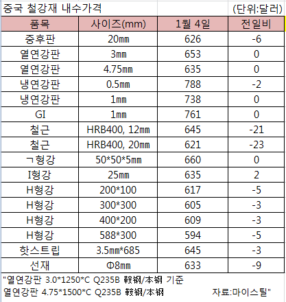 전반적 하락을 막을 길이 없다. 특히 철근 가격은 크게 하락했다. 1월 4일 중국 상하이 철근 내수가격은 12mm 21달러, 20mm 23달러 하락해 각각 645달러, 621달러를 기록했다.  이 외 건설용강재 모두 하락했다.