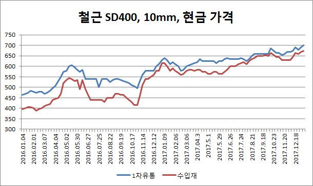 수입업계에 따르면 높은 오퍼가격을 기록했음에도 중국산 철근 가격은 톤당 67만원 수준에 머물러 있다. 1월 1주차에는 톤당 552달러(사강, 10mm기준)의 중국산 철근 가격이 국내에 상륙하기 시작했다.