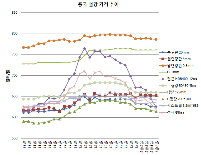 새해 시작부터 중국 건설용강재 가격이 곤두박질 치고있다. 철근(12mm)은 지난 주 29일 671달러에서 1월 5일 626달러로 일주일만에 45달러 하락했다. 선재도 일주일간 19달러 하락하면서 620달러에 멈춰섰다.