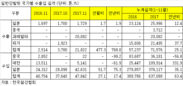 11월 일반강빌릿 수입량은 총 4만7,842톤으로 전년 동월 4만754톤 대비 17.4% 증가했다. 주요 일반강빌릿 수입국으로는 일본(4만2,631톤), 대만(5,141톤) 등이 있다.