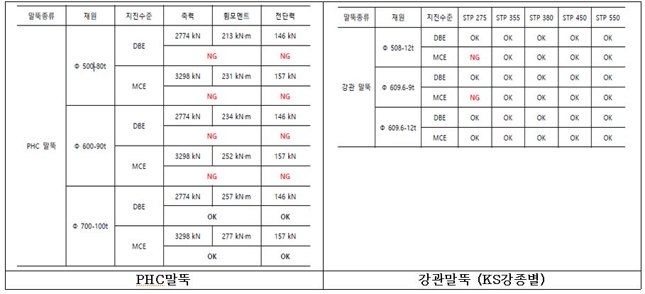 강관파일전문위원회의 검토결과 PHC 말뚝의 경우 축력과 모멘트의 조합응력은 물론 전단력에 대한 만족을 위해서는 반드시 말뚝 단면의 크기가 증가되어야 한다. 이어 강관말뚝의 경우 전단력에 대해 유리한 재료특성으로 인해 외경과 두께의 조정, 다양한 강종의 사용, 강재 내 힘의 재분배 등을 고려해 말뚝기초 설계에 다양한 옵션을 제공할 수 있는 실무적 장점을 가지고 있다고 판단했다. 이는 하부구조의 성능기반을 동일 건축 비용을 투입해 내진설계를 진행할 때 경제성 부분에서 강관말뚝이 PHC말뚝보다 높다는 결과를 이끌어낸 것이다.