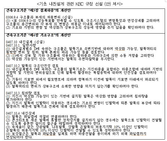 이에 따라 일반 건축물의 내진설계 시 최대예상지진에 대한 붕괴방지 내진성능을 발휘하기 위해서 건축물에 추가로 가해지는 전단력, 축력, 휨모멘트 등 기초파일에 치명적 취성파괴가 발생하지 않도록 하는 건축 기초부의 말뚝 설계 기준을 마련해야 한다.