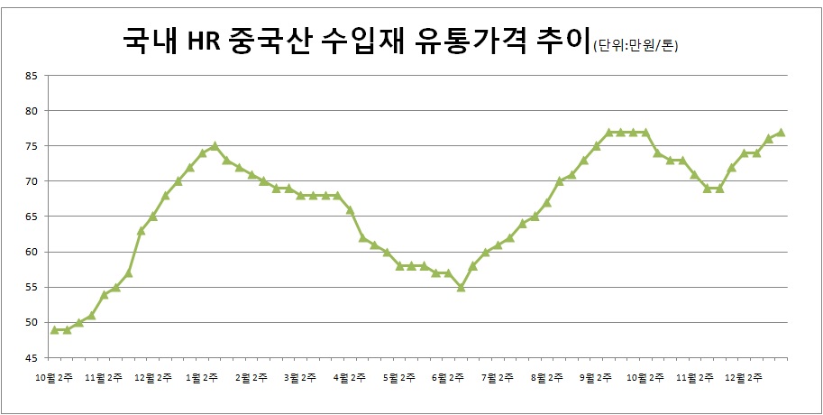 게다가 최근 국내 유통가격이 크게 오르고 있다는 점도 호재로 작용하고 있다. 최근 중국산 수입재 유통가격은 톤당 77만~78만원 수준을 기록하고 있다. 지난 11월에 비해 톤당 8만~9만원 상승했다.