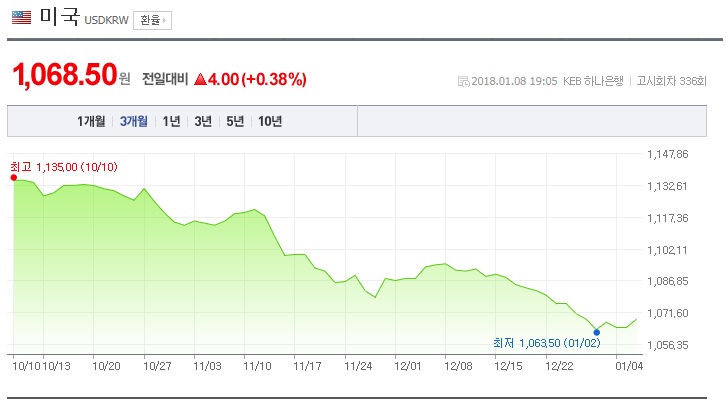 지난 8일 원/달러 환율은 1,066원을 기록한 가운데 오전 한때 1,058.8원까지 내려가며 3년 2개월 만에 1,060원대가 무너졌다. 증권사에서는 올해 연평균 원/달러 환율 전망치를 달러당 40원 하향 조정하는 등 전체적으로 환율 하락 기조가 이어질 것으로 보인다.