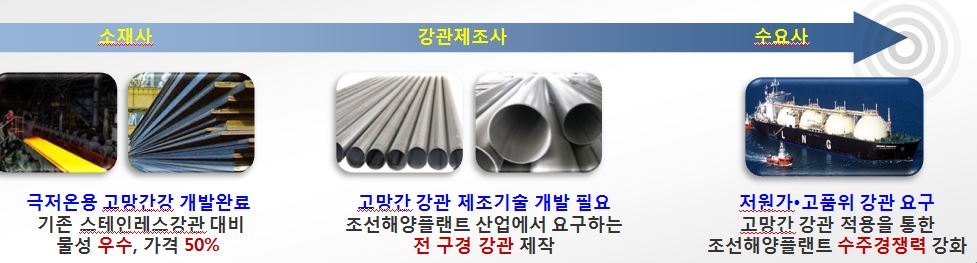 이번 연구개발의 목적은 조선해양플랜트산업에서 요구하는 전체 사이즈의 극저온용 고망간 강관을 개발해 신규 시장을 창출한다는 것이다. 전 세계적으로 환경보호정책에 따라 청정에너지인 LNG사용과 이에 따른 극저온 강관의 늘어날 것으로 예상되고 있다. 현재 LNG선에는 스테인리스(STS) 소재로 한 STS316, STS304 제품이 쓰이고 있다. 이를 대체하기 위해 연구팀은 고망간 강관을 비롯해 고망간강 SAW 용접을 통한 대구경 용접강관, 고망간강 인발용 모관 및 인발을 통한 소구경 강관을 개발에 나서고 있다.