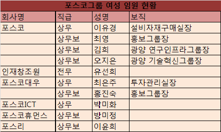 포스코 광양연구인프라그룹장 김희 상무보, 포스리 이윤희 상무보는 올해도 자리를 지켰다. 최은주, 이유경 상무, 김희, 이윤희, 최영, 오지은 상무보는 여성공채 1기 동기다.