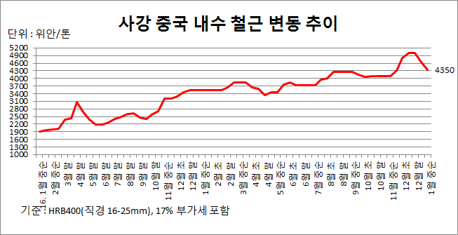 중국 유통업계에 따르면 이날 사강은 1월 11~20일에 출하하는 철근 가격(HRB400, 16-25mm, 공장 출고 가격)에 대해 지난 1월 초 대비 300위안 인하했다.