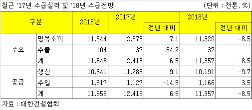 한편 지난해는 최근 몇 년 간 최고치 수준의 철근 생산, 내수 수요를 기록했다. 2017년 철근 생산은 전년 대비 9.1% 증가한 1,128만톤으로 추정(잠정)되며 ‘00년 이래 최고치에 근접한 수준이다.(‘03년, 1,140만톤)