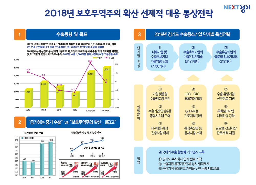 한편, 경기도는 올해 도내 기업을 내수·수출초보기업, 수출유망기업, 글로벌 강소기업으로 분류하고 ‘1단계 : 내수기업, 수출초보기업의 보호무역주의 대응역량 강화’, ‘2단계 : 보호무역주의 대응 수출초보기업의 수출판로 확장’, ‘3단계 : 보호무역주의 극복 수출유망기업의 글로벌 강소기업화’ 등 단계별 지원 전략을 추진하기로 했다.