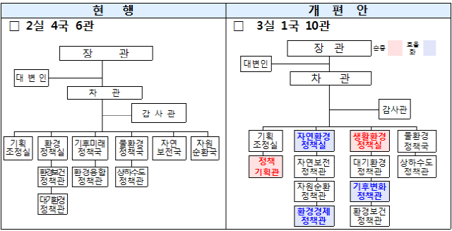 환경부는 실(室) 중심 체계로 개편해 책임행정을 강화할 방침이다. 우선 물·대기·폐기물 등 환경 매체별로 분산된 국(局) 중심 체계에서 자연환경과 생활환경을 두 축으로 하는 실(室) 중심체계로 개편한다. 두 번째 환경정책에 대한 기획·조정 역량을 높이고 지속가능한 정책 전담기능을 강화한다. 세 번째 환경정책의 미래 먹거리로 강조되고 있는 기후변화와 환경경제 분야를 총괄하는 전담기구를 신설한다. 네 번째 환경피해 구제를 비롯해 환경교육 및 환경감시 등 새롭게 강화되는 정책 기능을 효율적으로 수행하기 위한 전담부서를 신설한다. 마지막으로 국민 참여와 소통을 확대하기 위해 환경정책 홍보와 시민소통 기능을 강화한다.