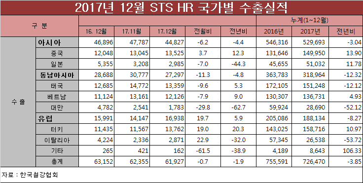 작년 태국으로의 STS 열연 수출은 전년대비 12% 줄어든 가운데 중국, 베트남, 터키로의 수출은 전년대비 늘었다.