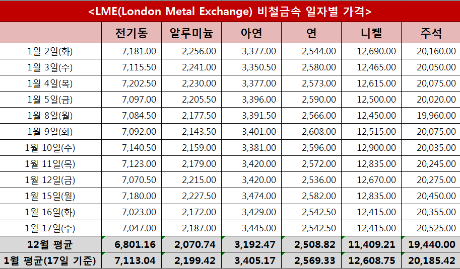 최근 런던금속거래소(LME)에서 거래되는 주요 비철금속 가격은 지난 17일까지의 1월 평균가격이 모든 품목에 걸쳐 전월대비 상승했다.