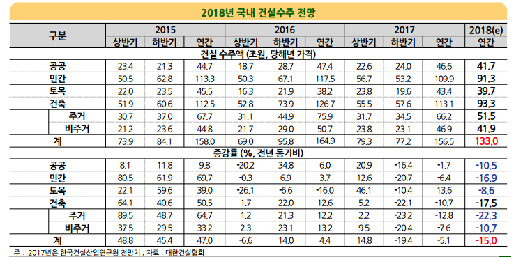 2018년 국내 건설 수주가 전년대비 15.0% 감소한 13조원을 기록할 것이라는 전망이 나왔다. 대한건설협회에 따르면, 2015년 이후 3년 동안 역대 최고 수준의 호조세를 보인 수주액이 올해 13조원을 기록, 2014년(107.5조원) 이후 4년래 최저치로 하락한다.