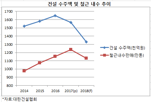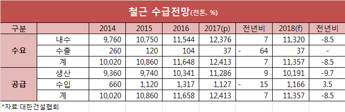 국내 제강사 한 관계자는 “2018년 철근 수요는 건설 수주 감소 및 투자 정체로 인해 연간 1,050~1,130만톤 수준의 명목 소비량이 예상된다”고 밝혔다.