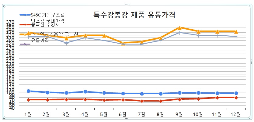2016년 12월초 S45C 기계구조용 탄소강과 SCM 구조용 합금강봉강 등 구조용강 제품의 가격인상을 시작으로 해서 2017년 1월 스테인리스봉강, 공구강, 금형강, 4월 추가로 구조용강 제품의 가격인상이 이뤄졌다.