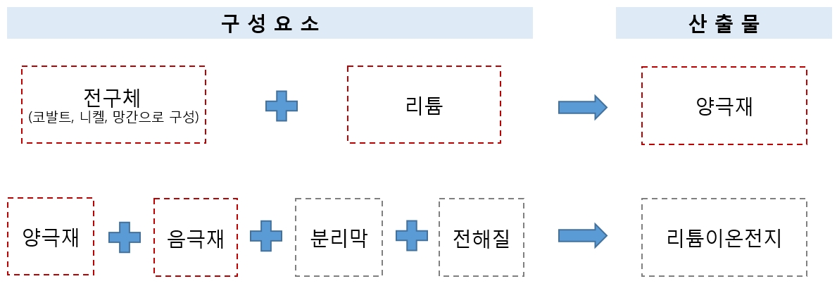 전구체란 양극재 제조의 상공정으로 코발트, 니켈, 망간을 결합해 제조된다. 전구체와 리튬을 결합하면 최종 제품인 양극재가 된다.