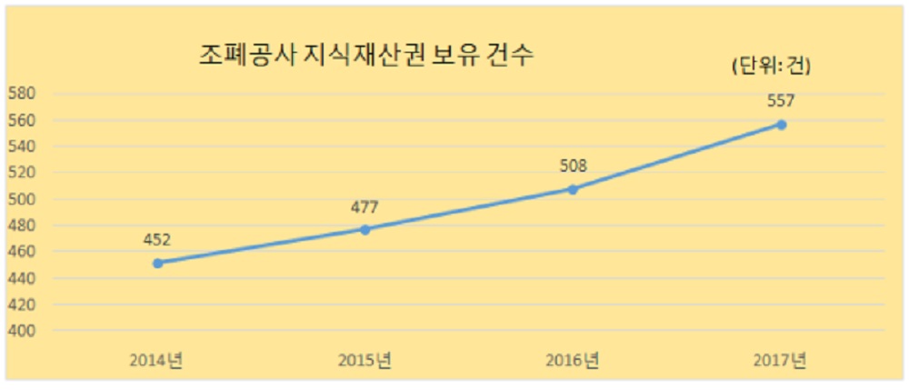 조폐공사는 25일 지식재산권 보유건수가 지난해 557건으로 2016년보다 49건 늘어났다고 밝혔다. 보유 지식재산권의 대부분은 위변조를 방지할 수 있는 기술에 관한 것이다.