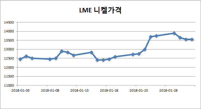 LME 니켈 가격이 지난 달 29일 톤당 1만3,890달러를 기록하며 12월 대비 1월 평균가격이 1,500불 수준 상승하였으며, 철광석 등 원자재 가격 또한 급등했다.