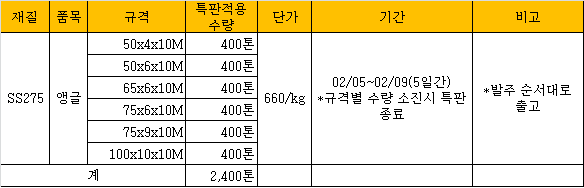앵글 특별 할인 수량은 총 2,400톤이다. 50x4x10M, 50x6x10M, 65x6x10M, 75x6x10M, 75x9x10M, 100x10x10M 등 규격별 400톤을 특별 판매하며 수량이 소진될 경우 특판은 종료한다.