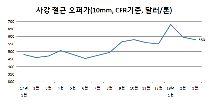 이는 직전 2월말적 오퍼가격인 톤당 595달러(10mm, CFR기준)에서 15달러 인하된 것이다. 13mm 이상의 규격은 톤당 570달러에 오퍼 가격이 책정됐다.