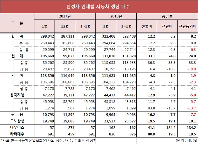 자동차 1월 총 생산량은 32만2,408대로 지난해 1월 29만8,042대보다 8.2% 증가한 것으로 나타났다.