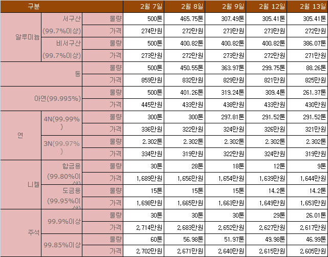 2월 13일 조달청 비철금속 비축물자 방출가격