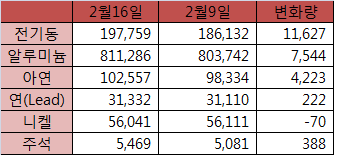 상하이 비철금속 재고량(2월16일)