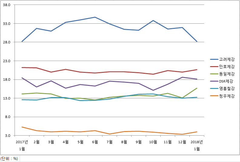 고려제강의 1월 점유율은 전월보다 3.7%p 감소했으나 전년대비로는 같은 수치를 유지하면서 점유율 선두를 지키고 있다.