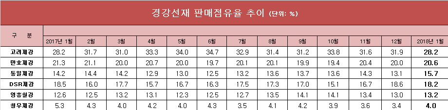 국내 경강선재 가공업체 주요 6개사의 판매실적 집계자료에 따르면, 지난 1월 고려제강의 판매점유율은 28.2%를 기록했다.