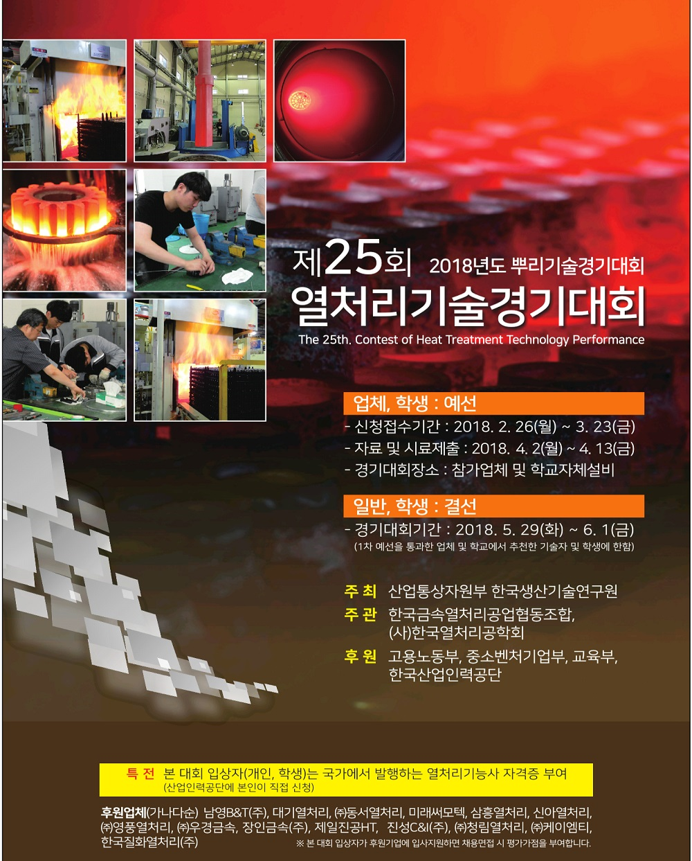 이번 열처리기술경기대회는 업체(일반)와 학생을 대상으로 예선(3월 26일~4월 13일)과 결선(5월 29일~6월 1일)으로 나누어 진행한다.