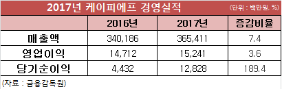 케이피에프는 2017년 잠정 영업실적으로 매출액 3,654억원, 영억이익 152억원, 당기순이익 128억원을 달성했다고 밝혔다. 이는 각각 전년대비 7.4%, 3.6%, 189.4% 증가한 수치다.