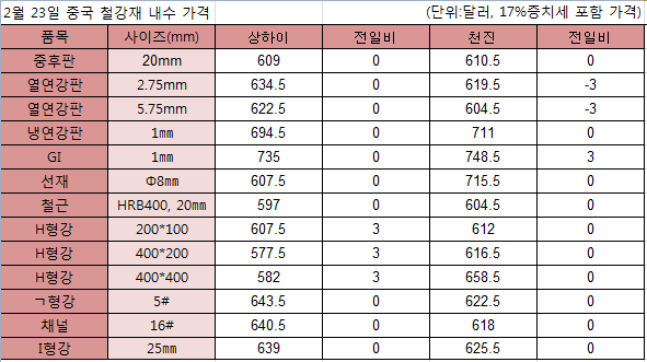 중국 철강 가격이 춘절 이후에도 큰 변동없이 잠잠한 상태를 유지하고 있다. 연휴가 끝난 다음 날인 22일에는 가격 변동이 없었고 23일에야 품목별로 소폭 변동이 있었다.