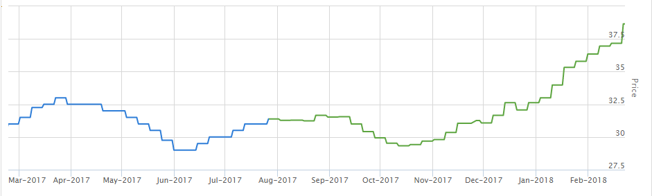 선물가격은 23일 5주간 최저점을 기록했다. 22일 춘절 연휴 다음날도 현물 거래가 거의 없었고 선물 역시 하락을 보였다.