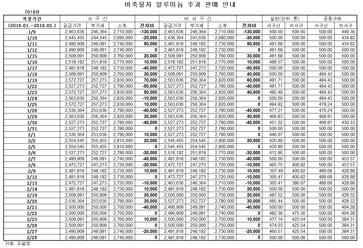 조달청 알루미늄 방출 가격(2018.01.~2018.02.)