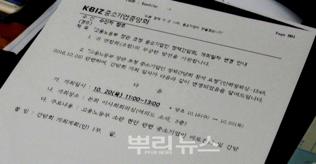 당초 19일 오전에 열릴 예정이던 이기권 고용부 장관과 중소기업중앙회를 비롯한 중기업체 대표들과의 정책간담회가 20일 오전으로 연기됐다. 이 장관 측에서 보낸 연기 공문. 정수남 기자