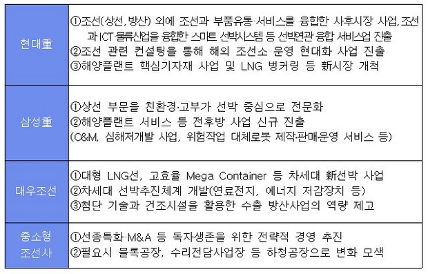 중소형 조선사의 경우 선종특화와 M&A 등 독자생존을 위한 전략적 경영 추진하고, 필요시 블록공장, 수리전담사업장 등 하청공장으로 변화도 모색한다.