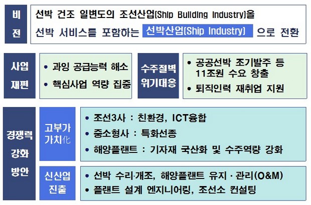 정부는 중소형 선박의 생산성 향상을 위해 10종의 표준선형을 개발하는 등 조선산업을 연간 1,000억달러(114조원) 규모의 선박서비스 산업을 포함하는 고부가 선박산업으로 육성한다는 복안이다.