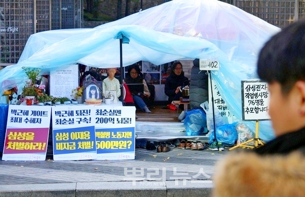 11일 본지 카메라에 400일 넘게 강남 삼성사옥 앞에서 농성을 펼치는 반올림 천막이 잡혔다. 반올림은 삼성그룹 산하 사업장에서 백혈병 등으로 사망한 유가족의 모임으로 삼성에 합당합 배상을 요구하고 있다. 이들이 최순실 게이트가 터지자 천막 앞에 새로운 현수막을 내걸었다. 정수남 기자