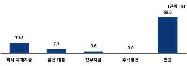이어 이들 기업은 은행대출(7.7%,2,057사), 정부 지원(3.6%,966사) 순으로 자금 조달이 많았다.