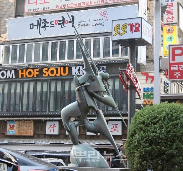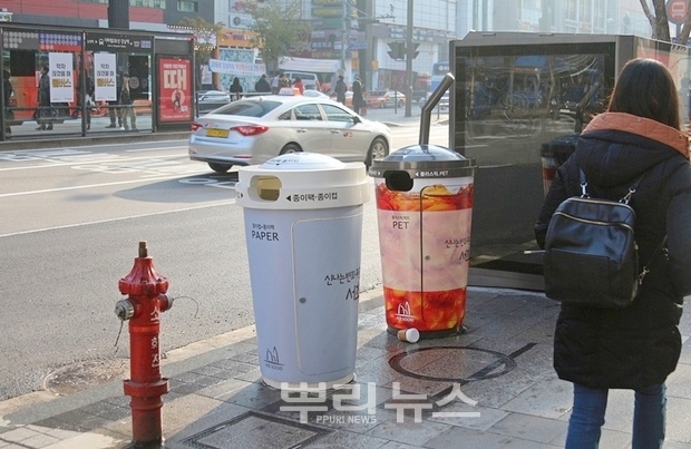 쓰레기통도 트렌드따라 1995년 국내에 쓰레기 종량제가 도입되면서부터 거리에 쓰레기통이 사라졌다. 가정에서 나온 쓰레기를 거리 쓰레기통에 버리는 얌체 행위를 근절하기 위해서다. 최근 들어서는 새로운 모습의 쓰레기통이 서울 도심 주요 지역에 등장하고 있다. 서울 강남대로 서초구 쪽 인도에는 최근 국내 불고 있는 커피 열풍을 반영한 플라스틱 커피컵을 흉내낸 쓰레기통이 설치됐다. 금형으로 만들어진 이 쓰레기통의 재질은 철이다. 옆쪽 소화전도 철재다. 정수남 기자