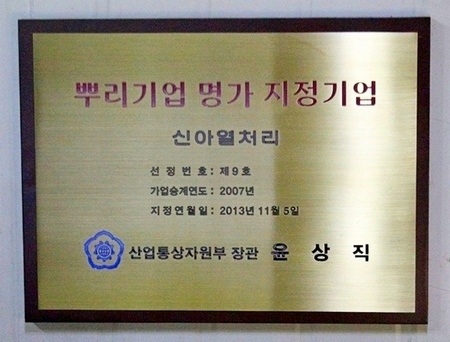2013년 신아열처리는 열처리 업계로서는 처음으로 뿌리기업명가 기업 1호로도 지정됐다.