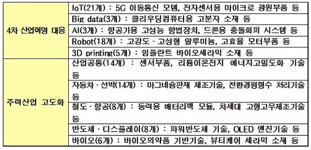 아울러 정부는 범부처 협업프로젝트인 국가전략프로젝트(34개 기술), 부처 간 협업(18개 기술), 산업부 자체 개발(48개 기술)을 통해 각각 추진하고, 미래창조과학부는 100대 기술개발 등을 뒷받침할 수 있도록 혁신적 물성의 소재개발 등 원천기술 확보를 위한 기초연구를 확대할 계획이다.