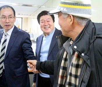 조합 이종길 전무와 인사를 나누고 있다. 정수남기자