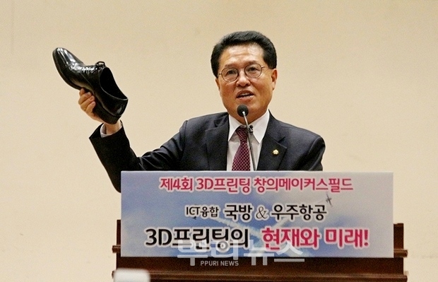 정 의원은 20일 국방위원회 김중로 의원, 미래창조과학방송통신위원회 송희경 의원과 새누리당 나경원 의원, 국회 교육문화체육관광위원회 안철수 의원, 국민의당 정두환 의원 등이 공동으로 국방·우주항공 3D프린팅 현재와 미래에 대한 국회 컨퍼런스에서 3D프린팅으로 만든 자신의 구두를 들여보였다.